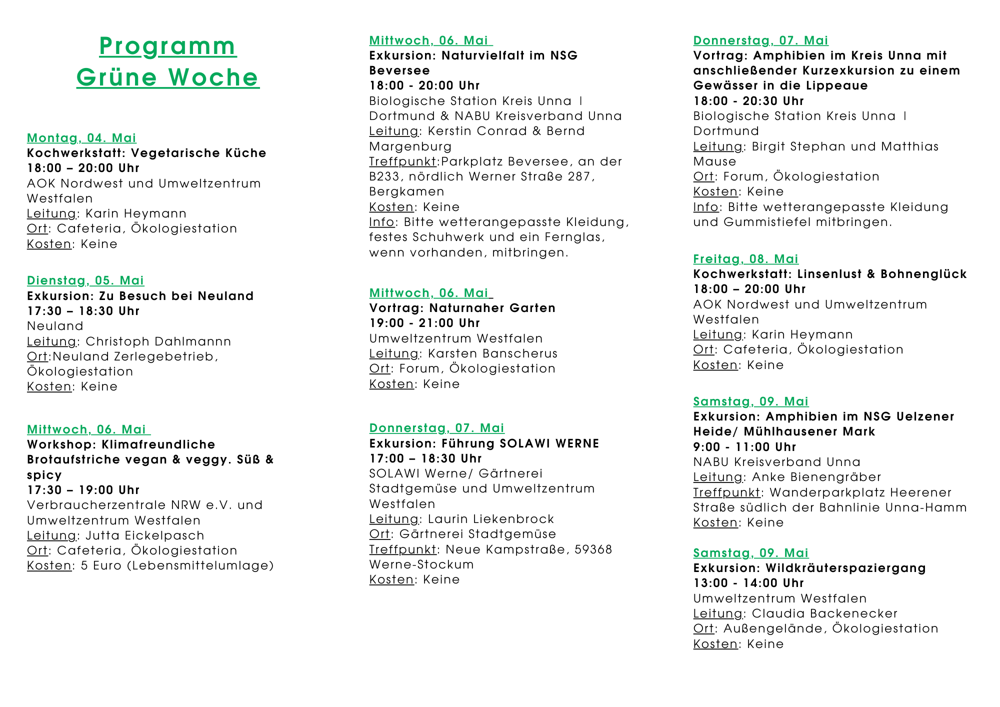 In dieser Woche erwarten die Teilnehmenden Workshops, Vorträge und Exkursionen rund um die Themen gesunde Ernährung, Amphibien und naturnahes Gärtnern. Ob bei der Kochwerkstatt, bei einer Exkursion zum Beversee oder in einem Vortrag über naturnahes Gärtnern – hier ist für alle etwas dabei.